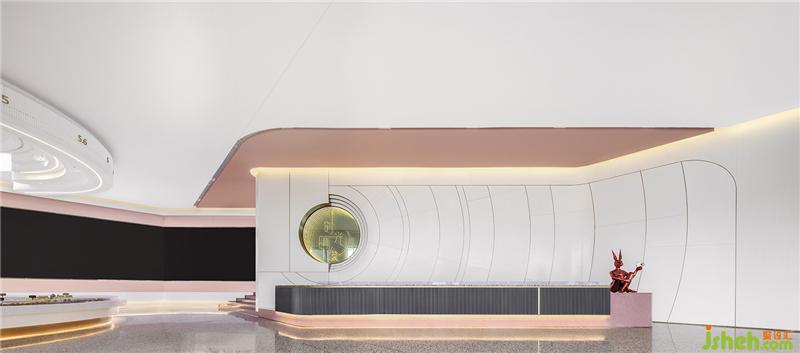 步入前廳,純白和藕粉色鋪陳優(yōu)雅的空間氛圍,水磨石地磚宛如少女的碎花小裙,為空間傾注年輕活力的感覺。簡約的色塊引領(lǐng)區(qū)域的劃分,同時帶領(lǐng)動線的深入銷售中心設(shè)計。