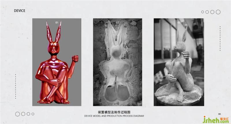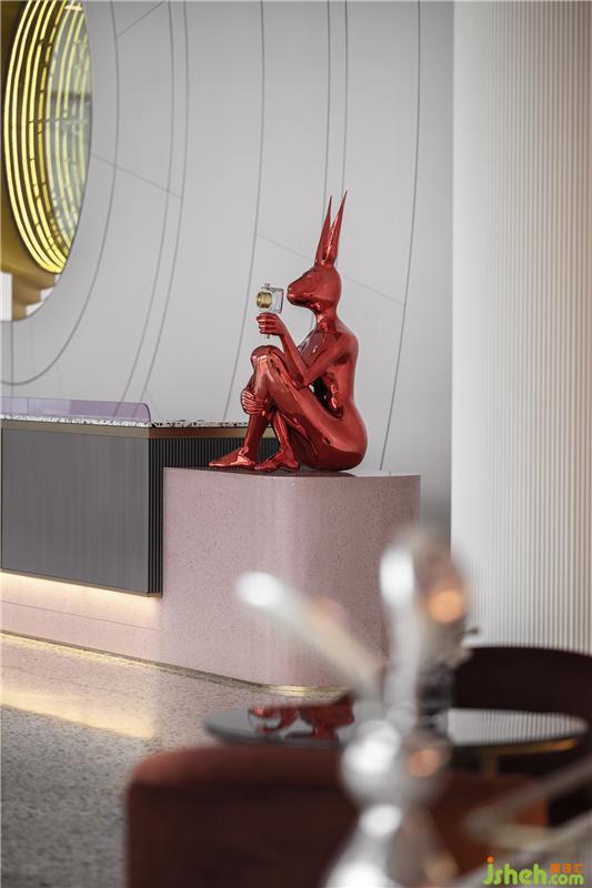 過道的藝術(shù)裝置別有趣味,紅色的兔子雕塑為空間注入盈盈活力。兔子代表我們內(nèi)心制造出的美妙夢境,而前臺的鏡頭記錄每段時光的美好印象,與前臺主題“時光印象”相呼應(yīng)。