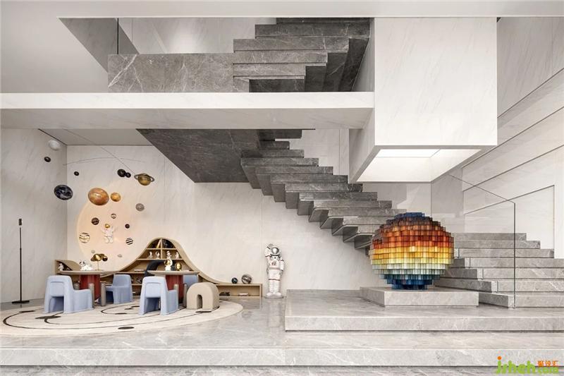 通往二層樓梯采用沉穩(wěn)的灰色大理石紋路設(shè)計,與墻飾形成空間上的呼應(yīng),灰白色系由淺至深,引人入勝。在此襯托下,由太陽系八大行星概念組成的裝飾球體,為低飽和度的空間注入一抹鮮色,成為點睛之筆廣州售樓處設(shè)計。