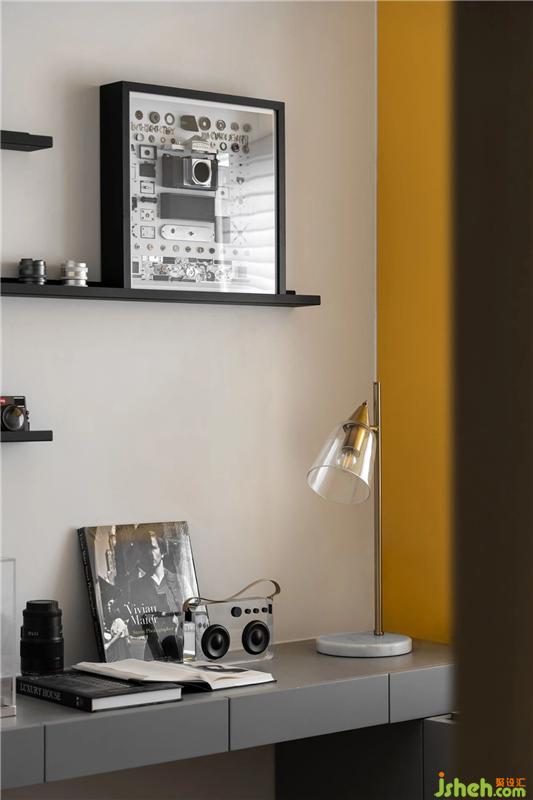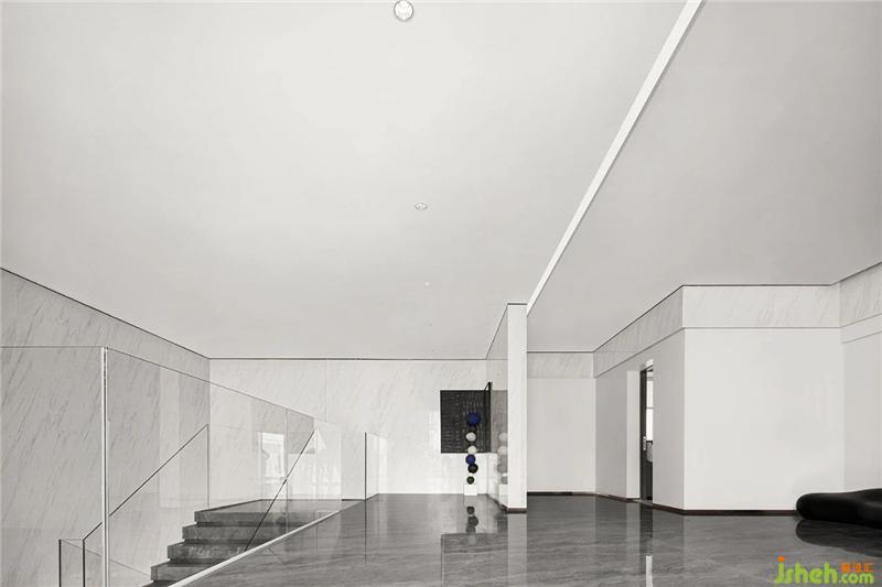二層的休閑平臺延續(xù)樓梯的灰色色系,平直的建筑線條與球形裝飾在寂靜的空間中形成強烈的對比,就像是宇宙黑洞中無盡的引力,平靜卻暗藏著巨大的震撼。