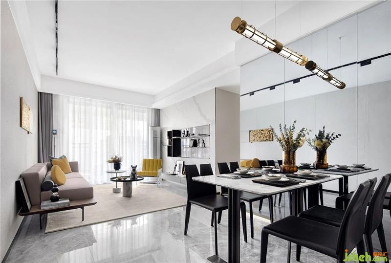 設(shè)計以低調(diào)的黑白灰呈現(xiàn)現(xiàn)代簡約之美,棕色打破沉悶節(jié)奏,提升空間質(zhì)感。硬朗的金屬、玻璃材質(zhì)凝練精致品味,上好的意式皮革及布藝則營造了柔軟舒適的居住氛圍。
