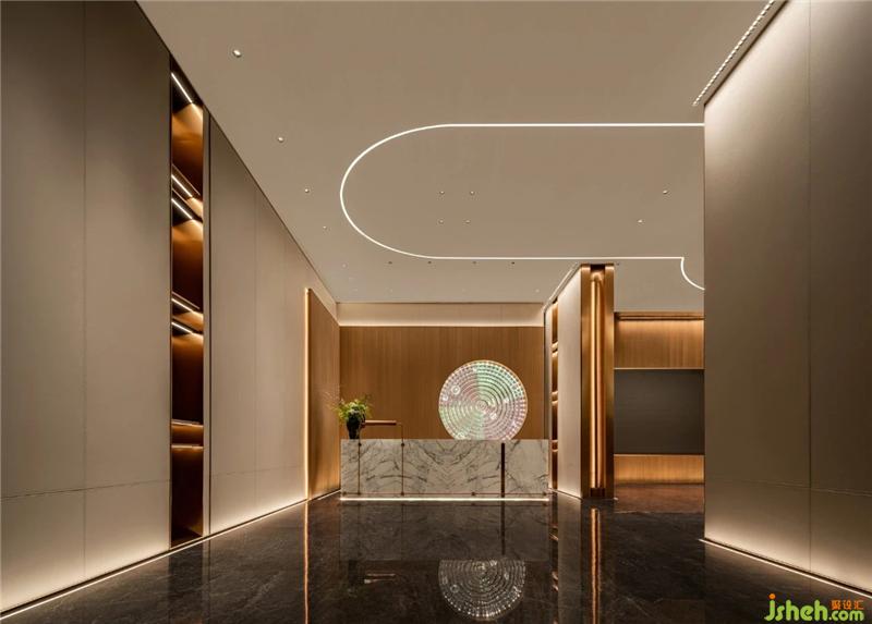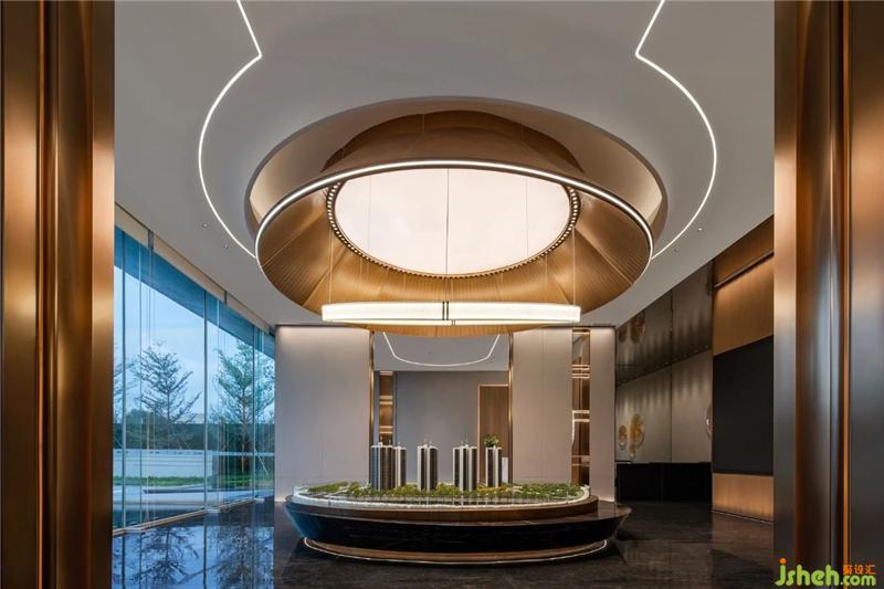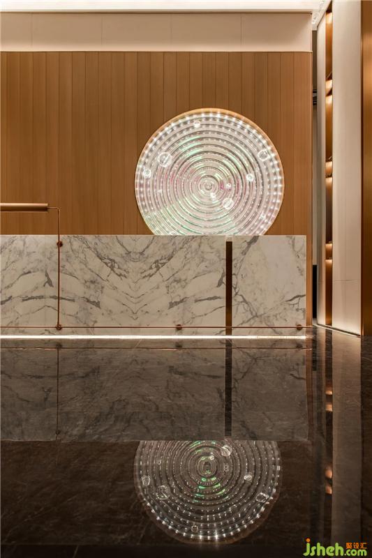 緩緩步入前廳,開敞宏闊的空間映入眼簾。日光初現(xiàn),晨露落于水面泛起漣漪,層層蕩漾,以亞克力的材質(zhì)定格于此,讓空間頗具動感,引人入勝。