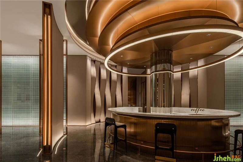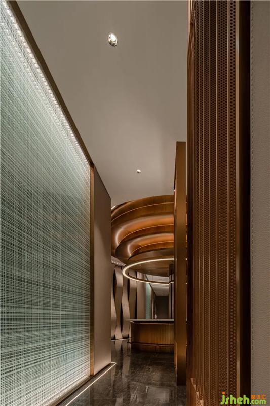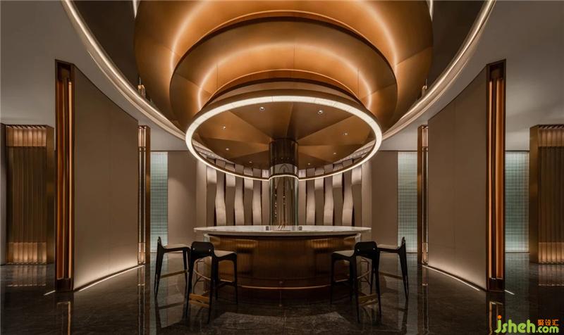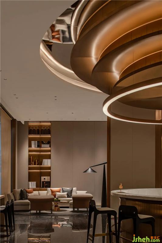 從屋頂墜下的層層圓環(huán),在燈光的照耀下閃耀著光澤,如明月漸漸升起。月光傾灑于海面,波光粼粼,泛起陣陣漣漪,營造出了舒適怡然的氛圍。