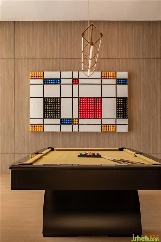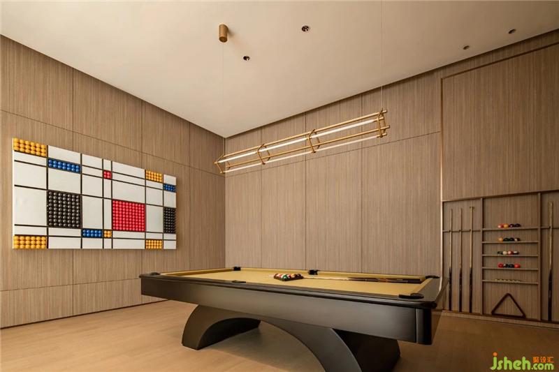 桌球室采用豎向板塊分割的木紋為主墻面,售樓處設(shè)計通過色彩鮮艷的小球成組的排列,形成了與空間特性相符的環(huán)境氛圍。條形燈帶設(shè)計,現(xiàn)代空間豐富柔而輕盈。