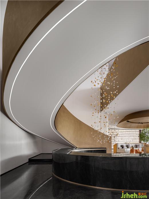 江西售樓處設(shè)計以優(yōu)雅的旋轉(zhuǎn)弧線環(huán)繞藝術(shù)品,自然的雨水落入湖中泛起波瀾漣漪,點上一杯茶或咖啡,靜坐片刻,仿佛有淅淅瀝瀝的細(xì)雨在耳邊響起。