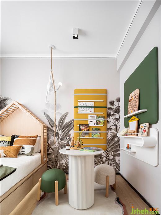 南昌樣板房設(shè)計以“動物王國”為主題打造兒童房,馬卡龍配色營造出鮮活的熱帶雨林氛圍,沉穩(wěn)的綠色調(diào)山林,在動物的守護下承載著小小山林之主的美夢。