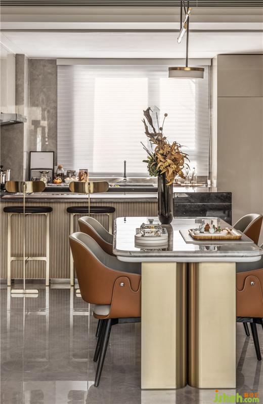 皮革、金屬的質(zhì)感為四時三餐帶來高雅的品味,西安樣板間設計開放式社交廚房的格局打開了每位親朋好友的味蕾。