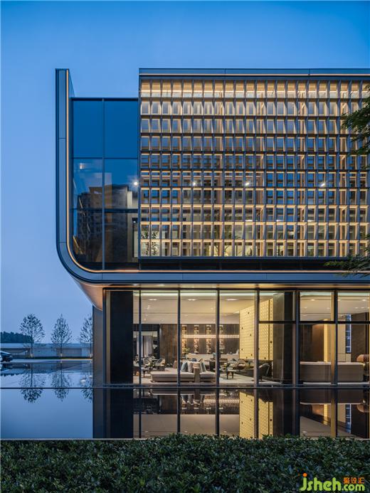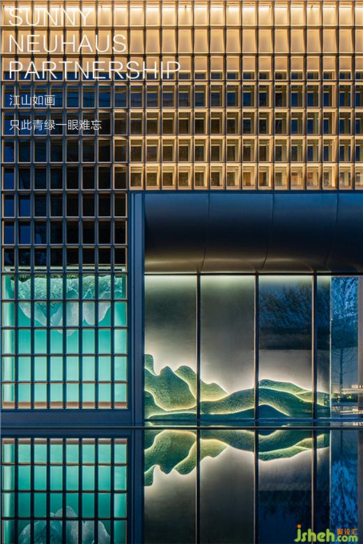 SNP圍繞《千里江山圖》展開概念設(shè)計(jì),常州售樓處設(shè)計(jì)提煉山水形態(tài)融入空間,墻面回應(yīng)建筑外型的架構(gòu)體塊。