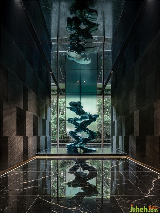 SNP設(shè)計(jì)師選擇了靈璧石雕塑,青綠之色呼應(yīng)沈宗騫的“重青綠者三四分是墨,六七分是色”,傳達(dá)江山的千年回響。