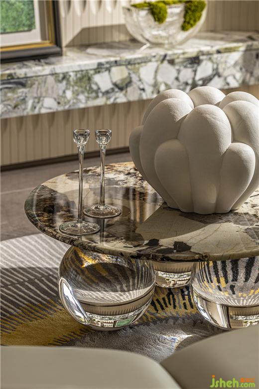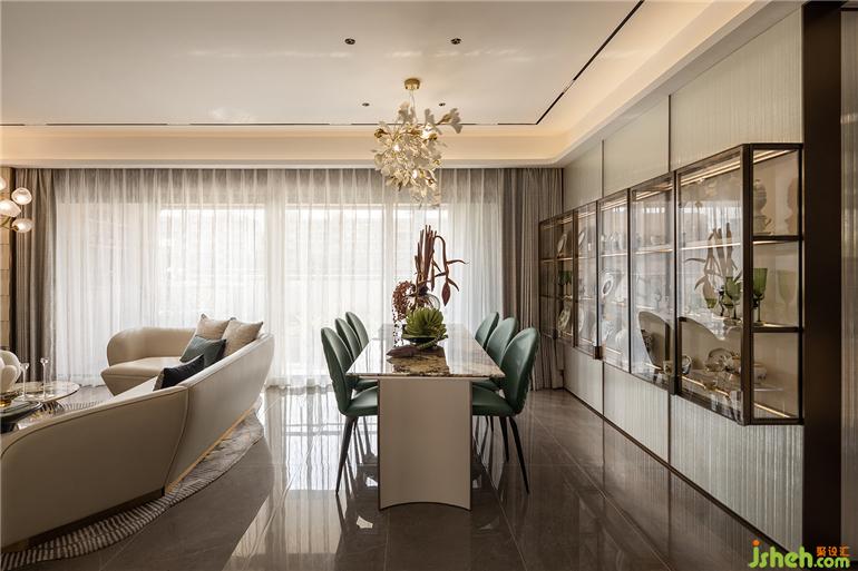 福州樣板間設(shè)計(jì)精致的瓷器藝術(shù)品,在陽光透過茶色玻璃的照耀下明亮動(dòng)人,一片片銀杏葉擬態(tài)組成的花燈,白金交織,頓生一室典雅。