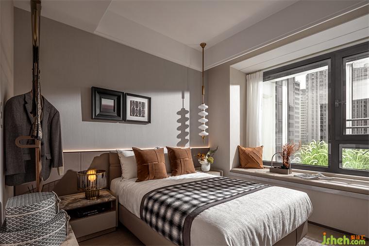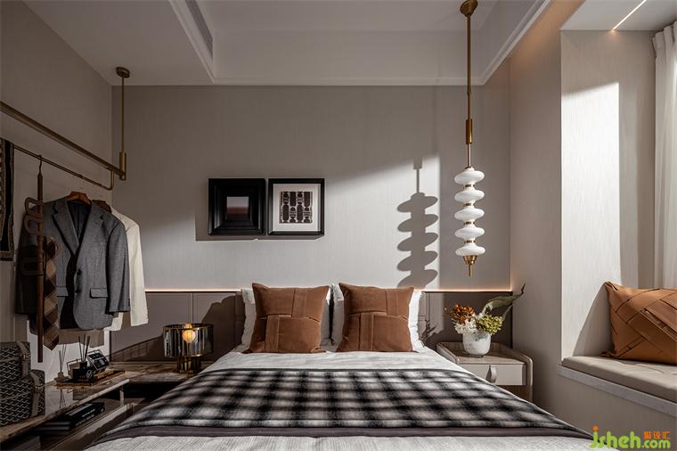 黑白格紋搭配橘色單品為臥室抹上沉穩(wěn)的底色,室外春意盎然,上海樣板房設(shè)計穩(wěn)重的秩序感中不乏憩息處的休閑舒適。