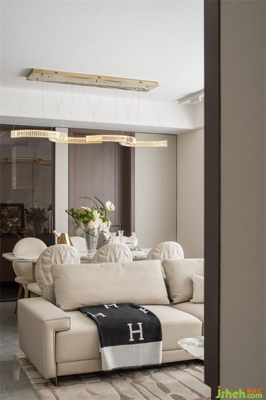 在“少即是多”的原則下,餐廳的燈具選擇了優(yōu)柔線條的玻璃質(zhì)感,金屬鑲邊,杭州保利樣板房設(shè)計勾勒別致的優(yōu)雅。