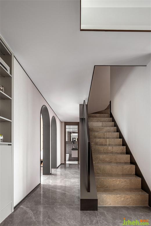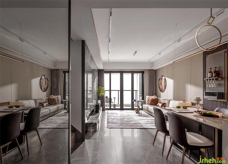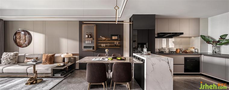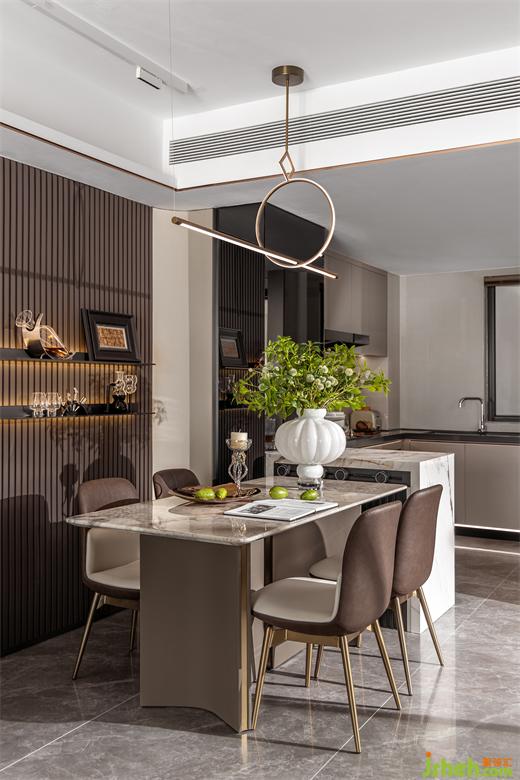 燈具選擇在一定程度上決定家的品味與舒適度,圓形、菱形與直線的幾何組合利落勾勒出雅致,深色木飾面作為餐廳的背景墻承載了吧臺的功能,與椅子的顏色呼應,凸顯成熟氣質。