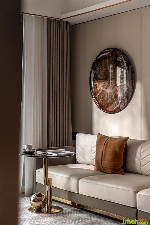 中山保利樣板間設計選用可移動的小茶幾,令中央活動空間更顯靈活寬敞,優(yōu)雅的金屬幾何體構造帶來藝術氛圍,與圓柱體臺燈相和諧,靜靜在書頁文字里找回深度閱讀的耐心。