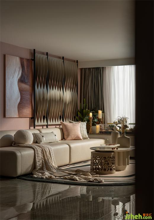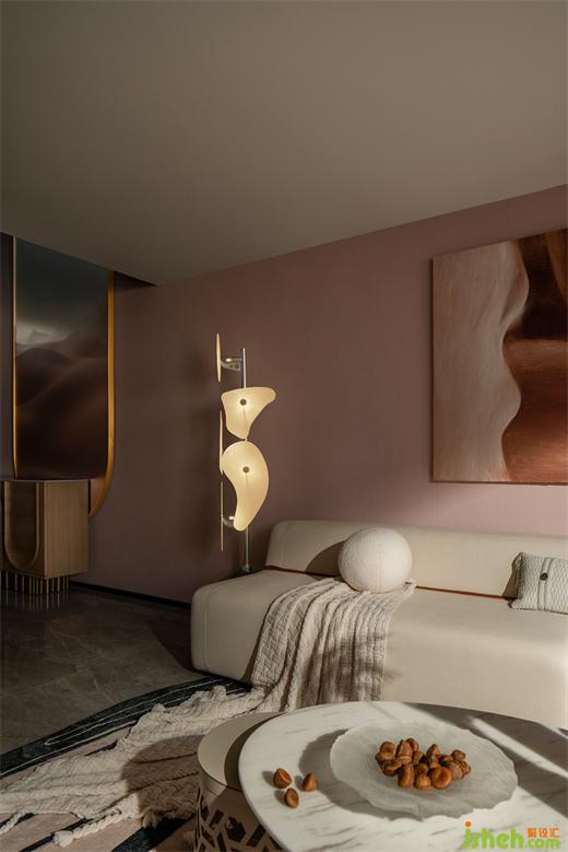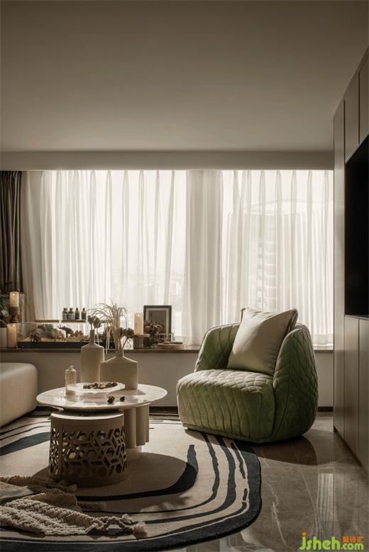 米色系用在室內(nèi)溫柔得恰到好處。廣州公寓設(shè)計(jì)莫蘭迪粉的墻面和薄荷綠絨面沙發(fā)的加入使色彩更豐富。