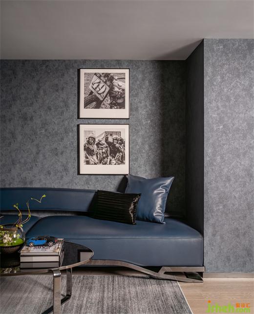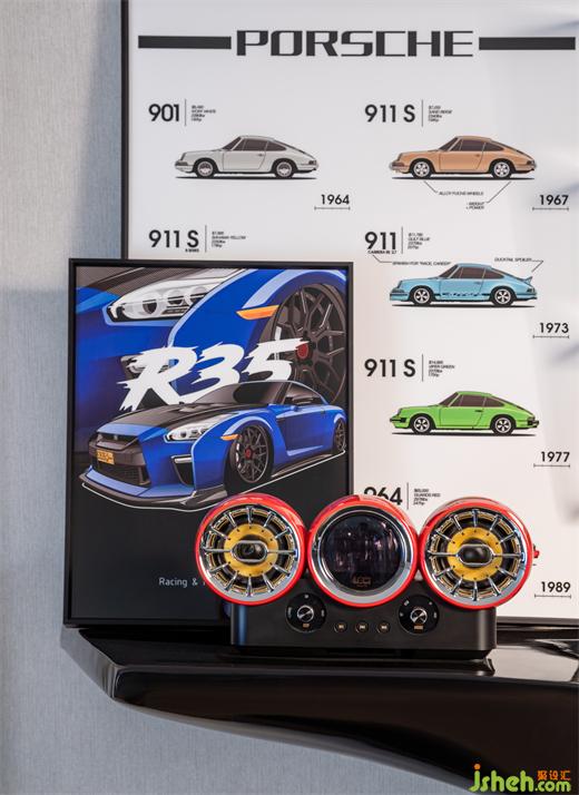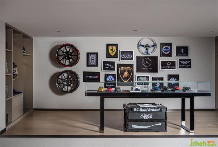 廣州公寓設計二樓作為私人辦公區(qū),工作、收藏展示功能融合,汽車元素是空間的主旋律。