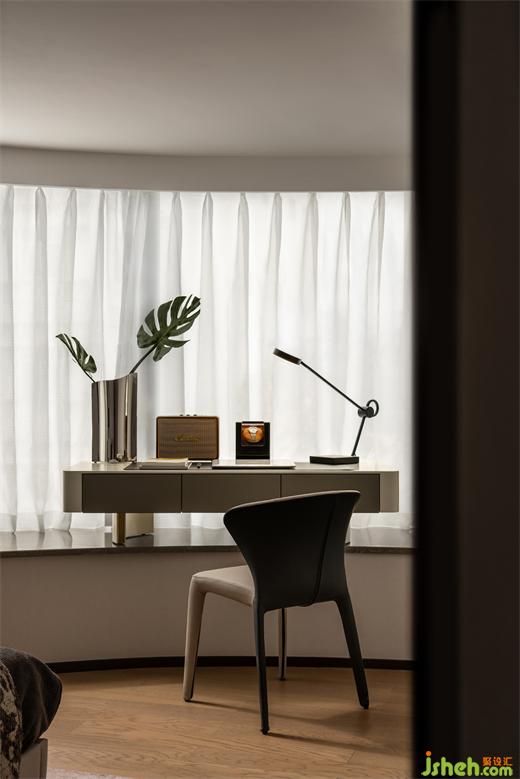 二層的居所兼具辦公功能。臥室收納必不可少,辦公功能通過和飄窗結(jié)合的小小工作臺實現(xiàn)。
