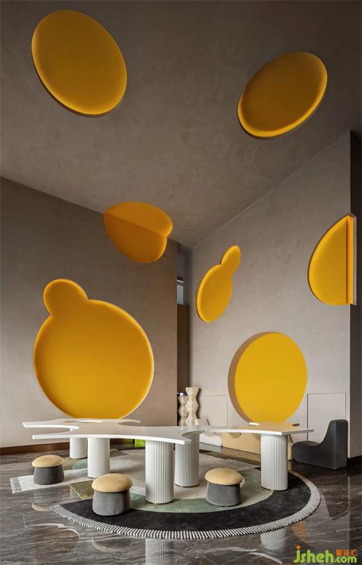 流暢的弧線,輕輕撫過空間,棱角和銳角都被撫平。柔和的奶酪色更讓兒童區(qū)充滿溫馨。