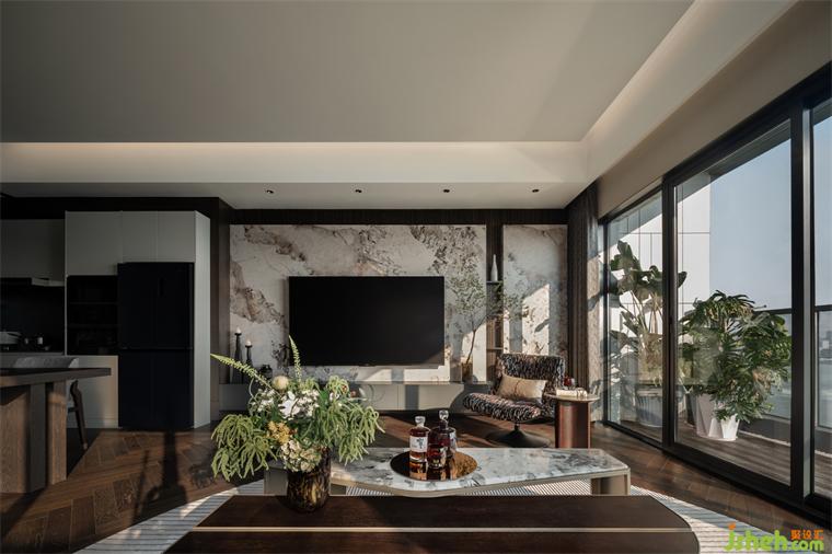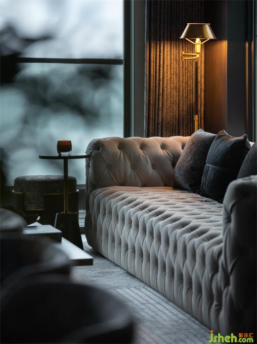 別墅裝飾拉扣沙發(fā)與石木拼合茶幾詮釋了不同材質(zhì)、形狀之間平衡的重要性。