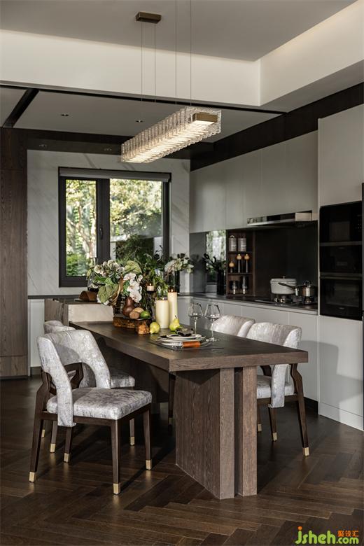 餐廚成為客廳的延展,島臺(tái)的加入創(chuàng)造更多可能性,別墅裝飾隱藏酒柜和柜邊燈充滿對(duì)生活細(xì)節(jié)的關(guān)懷。