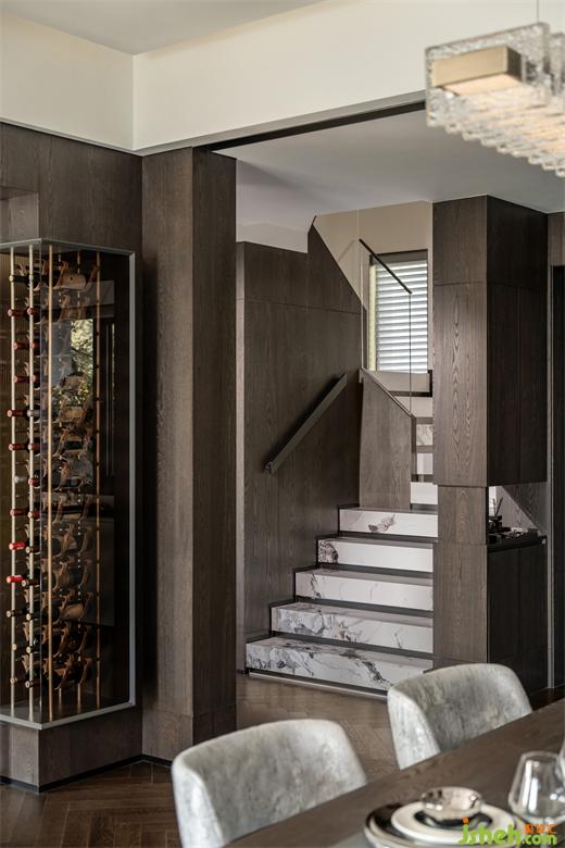 別墅裝飾利用三空間交匯處墻體制造極具通透感的玻璃酒柜。玻璃材質(zhì)的參與,使室內(nèi)體態(tài)輕盈,內(nèi)外融為一體。