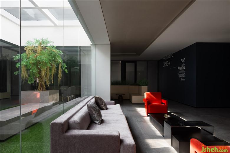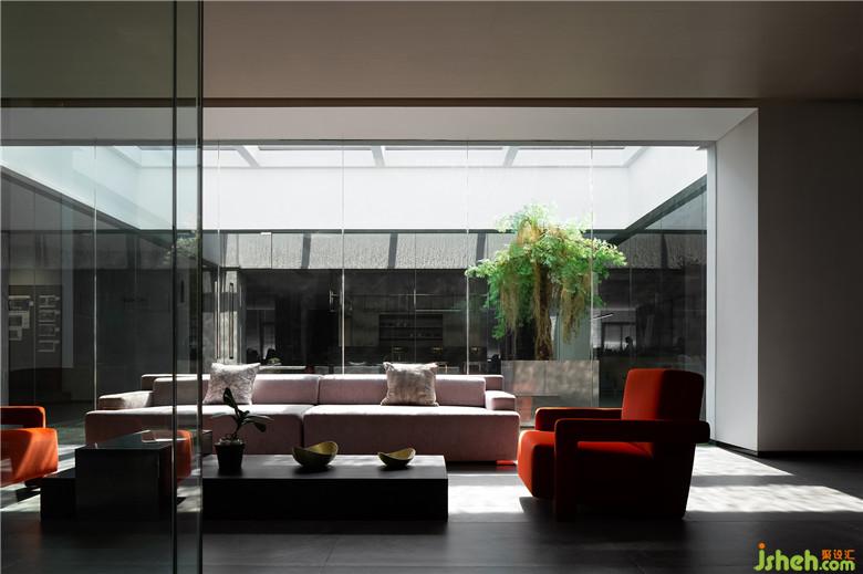 辦公區(qū)遵循人性化的空間表現(xiàn)形式,從心理角度出發(fā)建立員工對(duì)空間乃至企業(yè)的認(rèn)同感。以玻璃圍合的中央庭院成為設(shè)計(jì)亮點(diǎn),二次改造的天窗同時(shí)又是一座淺水池,陽(yáng)光透過(guò)水面射入庭院,人與自然便在光影蕩漾之間實(shí)現(xiàn)了巧妙的融合。