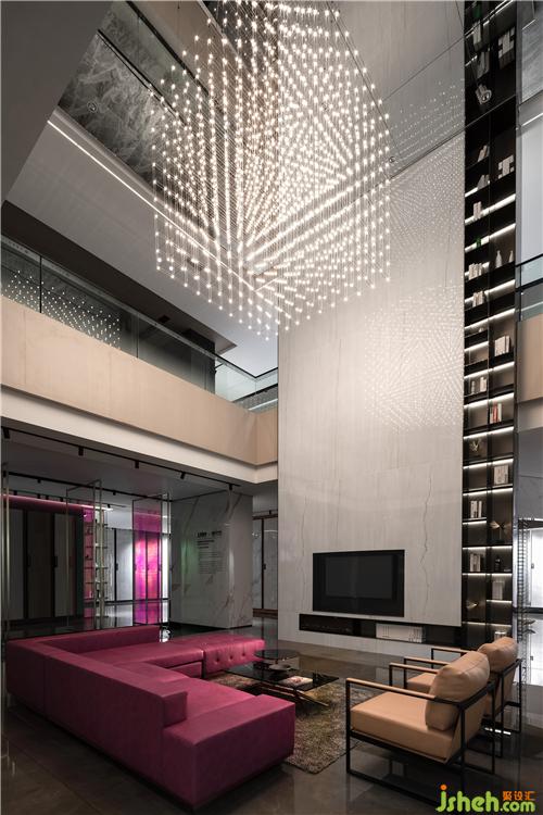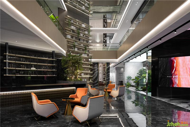 入口休閑區(qū)穿插著多媒體的形式以呈現(xiàn)最佳的展示效果,借助這種方式,讓客戶在虛擬場景空間中慢慢享受科技帶來的全新感受。漫步其中,伴隨輕柔音樂律動而產(chǎn)生迷離虛幻的動感畫面,虛擬的極光映襯在水面上,在空間中融合科技元素,創(chuàng)造出獨特的沉浸式場景體驗,勾引人們對未知世界的探索欲望。總部展廳設計
