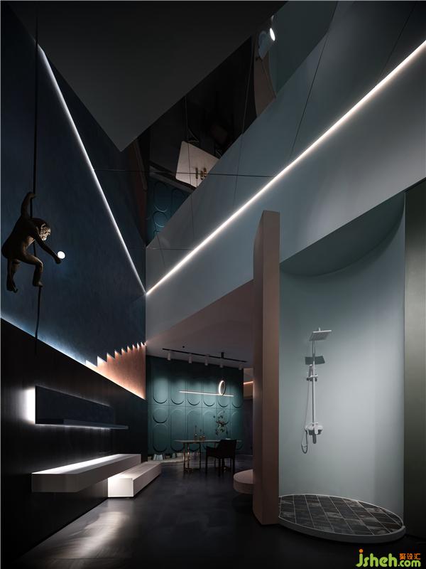 作為一個進口涂料品牌,PPG產(chǎn)品定位的客群是一些高端住宅用戶,然而現(xiàn)場3米左右的寬度顯然是無法滿足正常的家居空間尺度的,佛山展廳設(shè)計師通過左右挖掘和騰挪轉(zhuǎn)換,先是將隔壁一些閑置的空間借用了過來,再利用空間高度進行上下延伸,弱化空間邊緣,通過兩個盒子的適當(dāng)旋轉(zhuǎn)方式,將開間尺度進行拓展,起承轉(zhuǎn)折,一步一景,用建筑語言改變原有狹長空間屬性,使空間更具有豐富的流動性和視覺的延深感,通過體塊曲面和斜線的重組再造空間的物理屬性和空間美學(xué)。