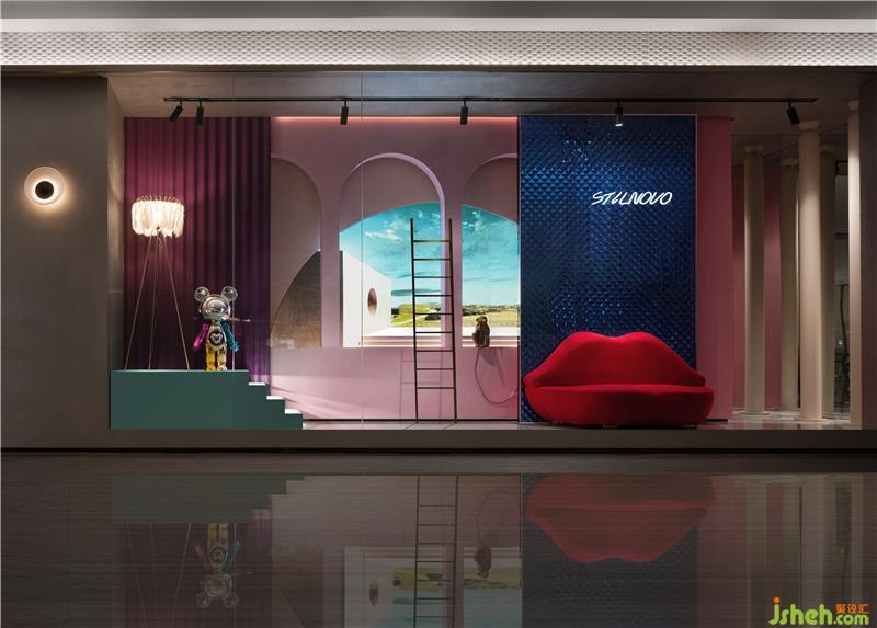 人人心目中都有一份對詩和遠(yuǎn)方的向往,設(shè)計師亦希望通過充滿浪漫和幻想的櫥窗空間激發(fā)觀者對于未來的期盼和探索欲,拱形窗戶引入唯美的自然景觀,將人們的思緒從室內(nèi)牽引到空曠的原野,極具夢幻色彩的涂料搭配上浪漫時尚的紅唇沙發(fā),仿佛是站在巴黎街頭,頑皮的小猴跳上窗臺,臺階上的可愛的暴力熊,又仿佛進入童話樂園,佛山展廳設(shè)計師希望通過故事般的敘事手法營造空間,極大的激發(fā)參觀者的好奇心,從而引導(dǎo)他們進去一窺究竟!