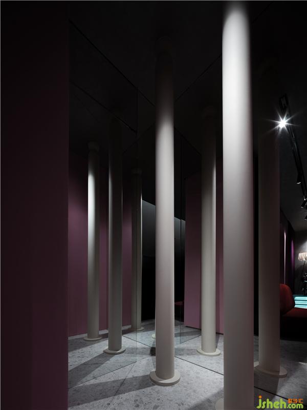 以室內(nèi)建筑的概念呈現(xiàn)內(nèi)部造型與體驗,利用蜿蜒、翻卷的有機立面弧度,打破空間均衡的常規(guī)格局,滑順且連續(xù)的曲面,銜接或錯位地構(gòu)筑層層包覆感,營造舞臺靜候開演前深邃而神秘的氣質(zhì)。不同弧度的曲線將各個空間連接起來,極度延伸的視覺觀感為場景帶來律動和節(jié)奏。精確把控的布局和尺度為空間景觀的顯與隱奠定了基礎(chǔ)框架。所有墻面、柱體、照明、軟裝,都不可以作為獨立空間的分隔,它們只是整體流線中環(huán)環(huán)相扣的一個節(jié)點,所有的人與物都在這里發(fā)生聯(lián)系。和眾多穩(wěn)固量體產(chǎn)生鮮明對比的視覺焦點,是空間底部兩面自地貫穿天花板的曲墻,宛如飄逸輕盈的長袖一揮,讓人對室內(nèi)建筑的墻體量感產(chǎn)生有趣的錯覺。