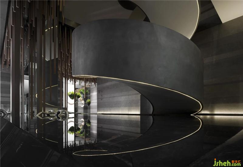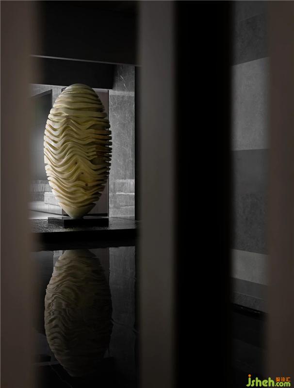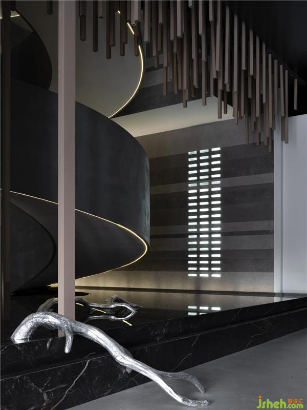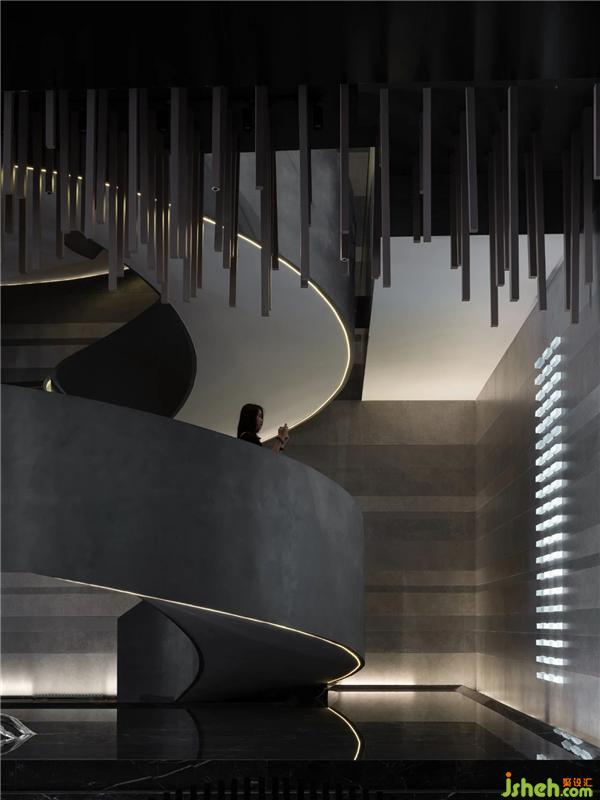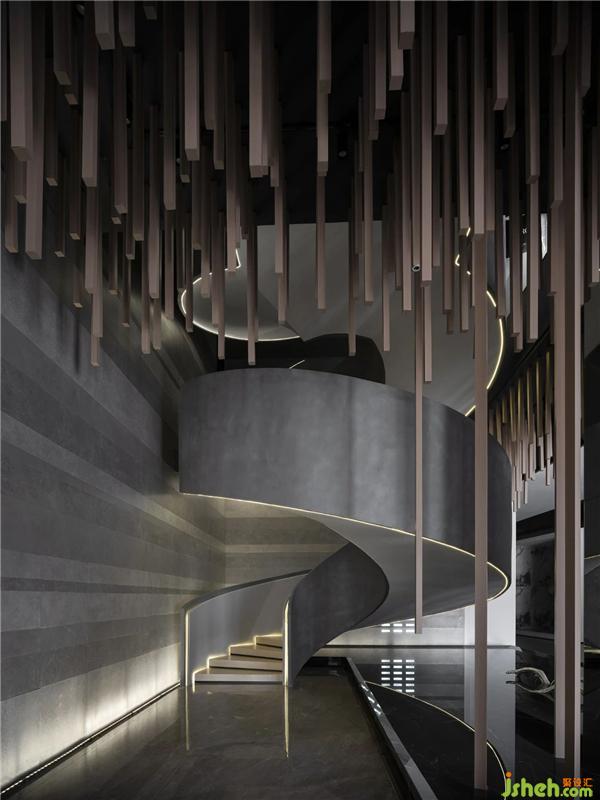 拾階而上,以灰色水磨石墻面以及微水泥質(zhì)感的樓梯扶手為主調(diào)的樓梯間表達出空間的自然寧靜,蜿蜒而上的旋轉(zhuǎn)樓梯將人的視線向上延伸,榕樹枝干沿著空間的間隙向上穿插,弧形曲面和垂直線在空間里相互對比,這種沉浸式的空間氛圍極大的調(diào)動參觀者的好奇心,希望能更進一步的一探究竟,設(shè)計師在空間表現(xiàn)上除了強調(diào)視覺的美感更希望挑動觀者的心理情緒。