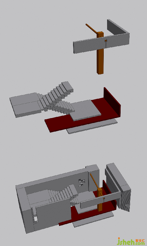 建筑原樓梯間本是一個(gè)平淡無奇的雙跑樓梯構(gòu)造,設(shè)計(jì)師刻意強(qiáng)化和凸顯的樓梯間的空間構(gòu)造,使樓梯間呈現(xiàn)出一種結(jié)構(gòu)美學(xué)體驗(yàn)感。材質(zhì)上選用赭紅色的銹鐵質(zhì)感的巖板搭