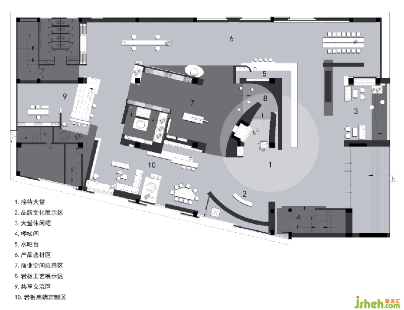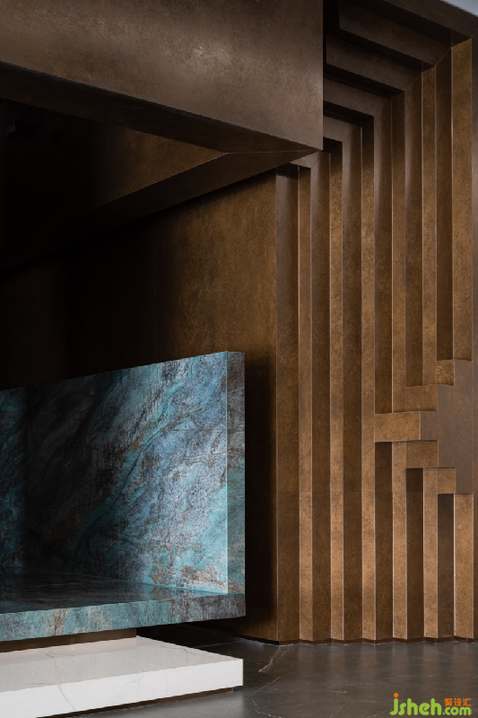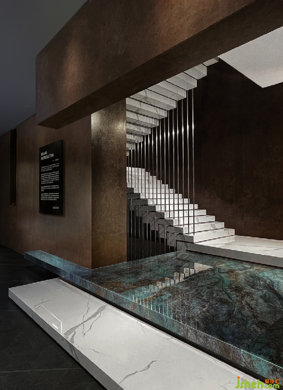 自然的色彩過渡將人們的視覺平移至室外的天然風(fēng)光,運用光線的變化,在質(zhì)樸中呈現(xiàn)出永恒和典雅。環(huán)顧空間整體布局,以半隔斷式的設(shè)計手法巧妙置景,傳遞更加開放、自由、溫潤的氛圍,隨著步入者的位置變換與視線流轉(zhuǎn),不同角落皆可自成一幅畫卷佛山巖板展廳設(shè)計。