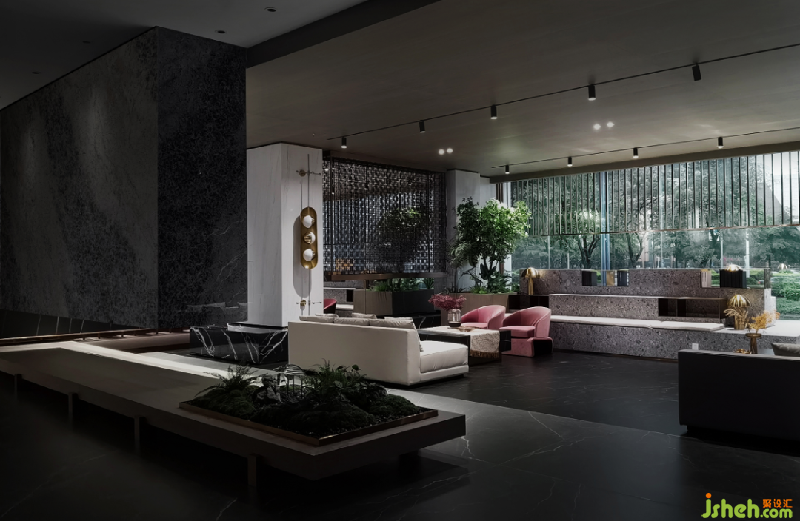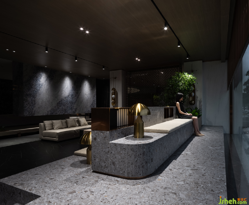 大堂吧通過松弛有度的地臺設(shè)計,營造一處內(nèi)外有別的休閑場所,向內(nèi)可以輕松暢聊,向外可以欣賞窗外的景致,水磨石質(zhì)感的坐臺顯出自然生態(tài)感,金屬屏風(fēng)以及臺燈更增加精致的生活品質(zhì)感,理想與現(xiàn)實于此碰出最相宜的相處模式。