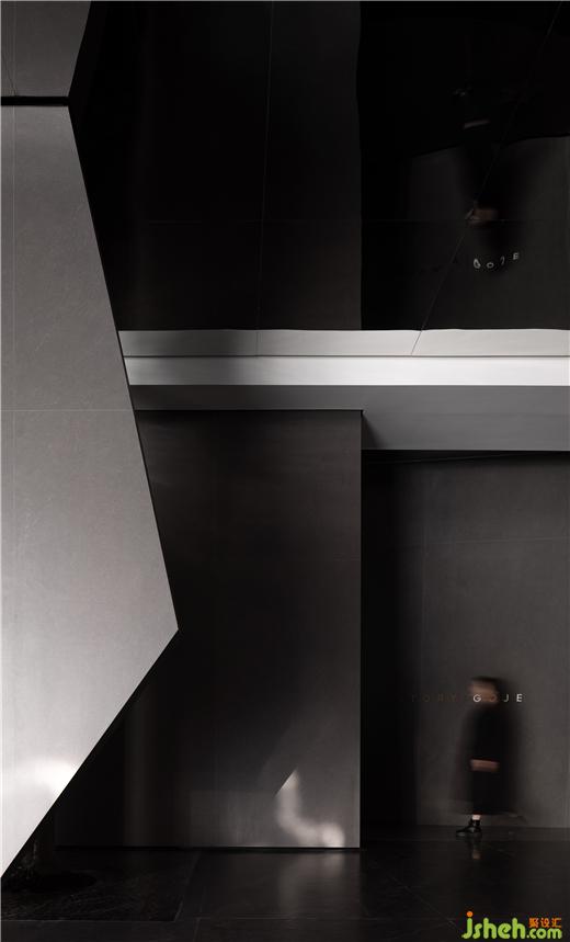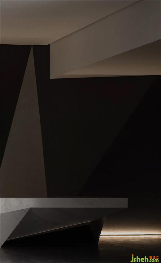 大堂以斜形切割重新構(gòu)建巖板展示空間,擺脫建筑原有的橫平豎直方式,巖板展廳設(shè)計(jì)塑造一種類似于“菱境”般的空間狀態(tài)。菱形切割是鉆石的加工方式,代表了一種極致的加工工藝,菱形切割使每個(gè)塊面都呈現(xiàn)出不同的受光狀態(tài),展現(xiàn)了獨(dú)特的幾何之美。