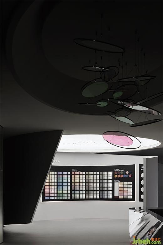 在展廳的大堂領域,一組絢麗的圓形彩色亞克力燈片宛如星辰點綴。燈光如詩,穿越彩色的亞克力燈片,輕輕撫摸過墻面和地面,把空間幻化成夢幻的彩色宇宙。這一巧妙的設計,如同旋律繞梁,不僅在視覺上演奏出動人的音符,更賦予了展廳獨特的靈魂和氣質,進一步詩化了涂料展品的主旋律和特色。