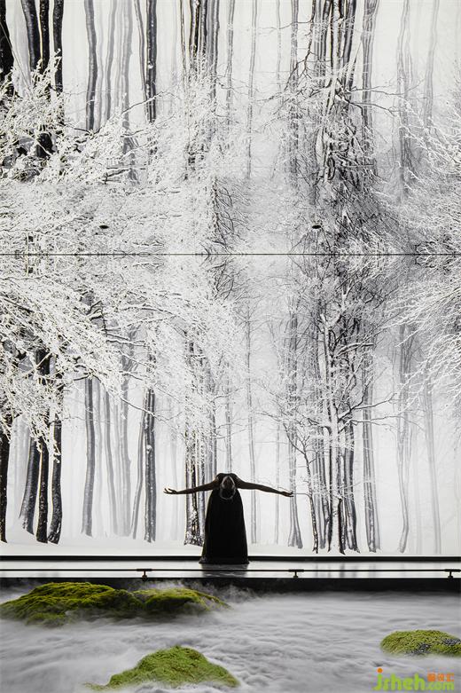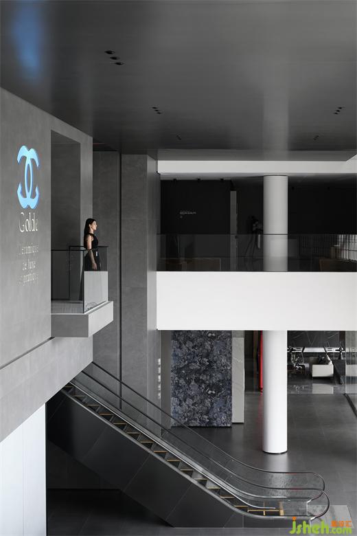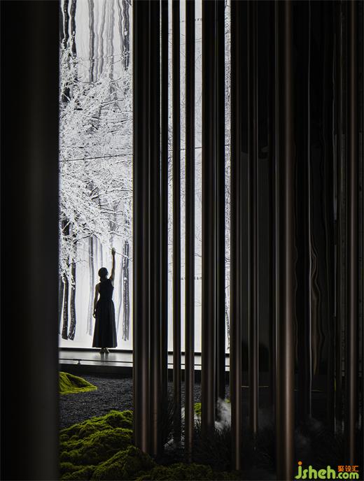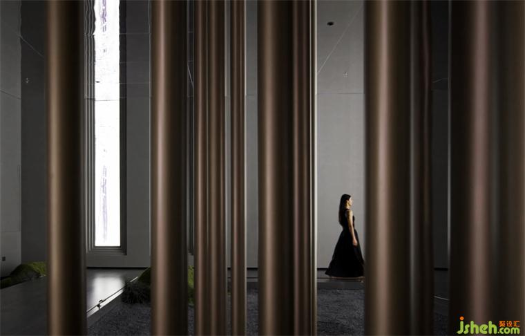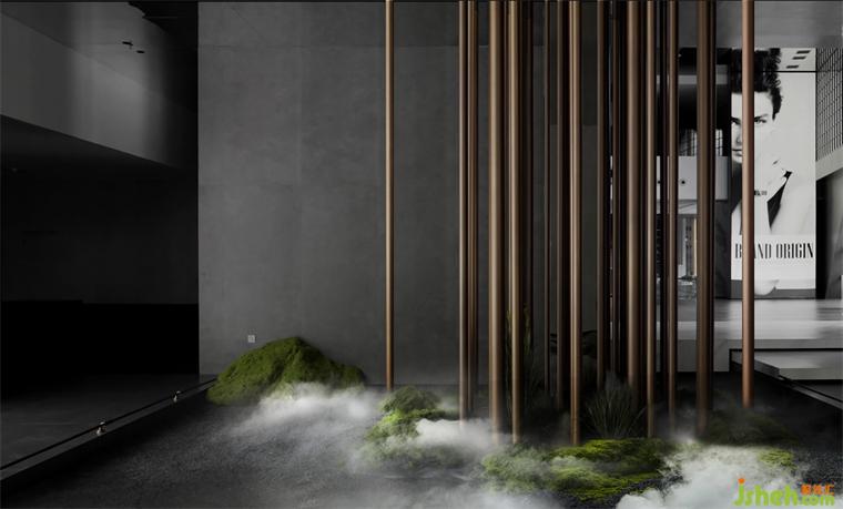 穿過大堂盡頭,恍若進(jìn)入一片森林秘境,無限的延展與放飛想象,讓身心合一,感受心靈與自然親密接觸。瓷磚總部設(shè)計(jì)師在這里用虛實(shí)相加的手法營(yíng)造了一片森林秘境,用粗細(xì)不同的不銹鋼圓柱做成叢林,在叢林中設(shè)置造霧器使云霧彌漫開來,和虛擬的霧凇林相互映襯,穿過叢林的一條U形棧道增加了進(jìn)入該空間的儀式感,
