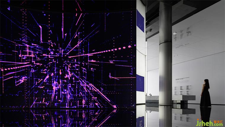 設(shè)計師在此空間重點表達了產(chǎn)品的健康能量功能,瓷磚總部設(shè)計在空間的整體留白中以極簡的文化符號,訴說產(chǎn)品持續(xù)釋放出的一種遠紅外線和負氧離子,讓人沉浸其中,感受產(chǎn)品降解甲醛、抗菌、降低室內(nèi)裝修污染的物理性功效。健康體驗空間,整體以純白的色彩氛圍,構(gòu)造出“凈化空間”的意境,通過一面變幻的LED墻面,將遠紅外線具象化,讓人一目了然它的光波漸變蔓延和擴散的軌跡。
