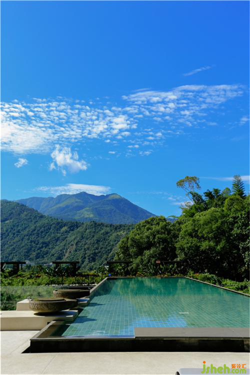 山巔之處無(wú)邊界泳池,設(shè)計(jì)像懸浮在樹(shù)梢上,池水透過(guò)石磨造型注水器緩緩流下,如同藝術(shù)品一般。容納著流水與光景,在這里遠(yuǎn)離了人聲鼎沸,隨處可見(jiàn)能躺平的休閒椅,上聞見(jiàn)高山遠(yuǎn)樹(shù)、絲絲安逸靜美的氣息。酒店設(shè)計(jì)