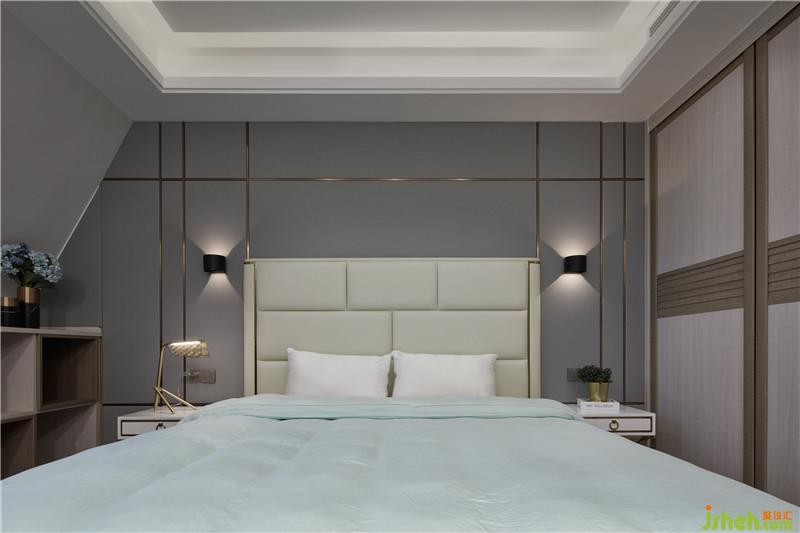 背景墻由灰色硬包加金屬條鋪陳,營造現(xiàn)代氛圍,在床頭壁燈的呵護下,以柔和被褥作映襯,渲染一種親和淳樸、安享自身的人生態(tài)度。