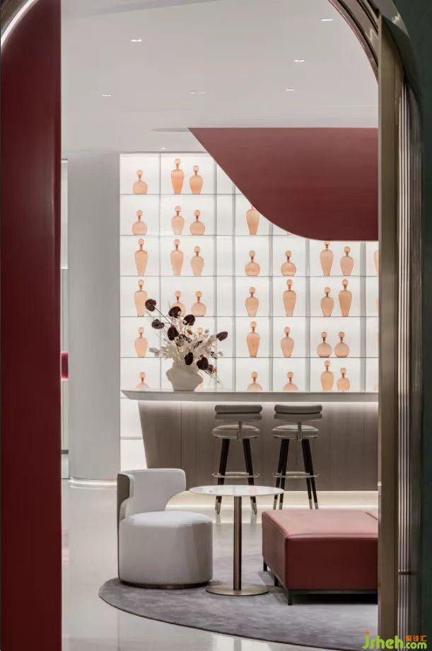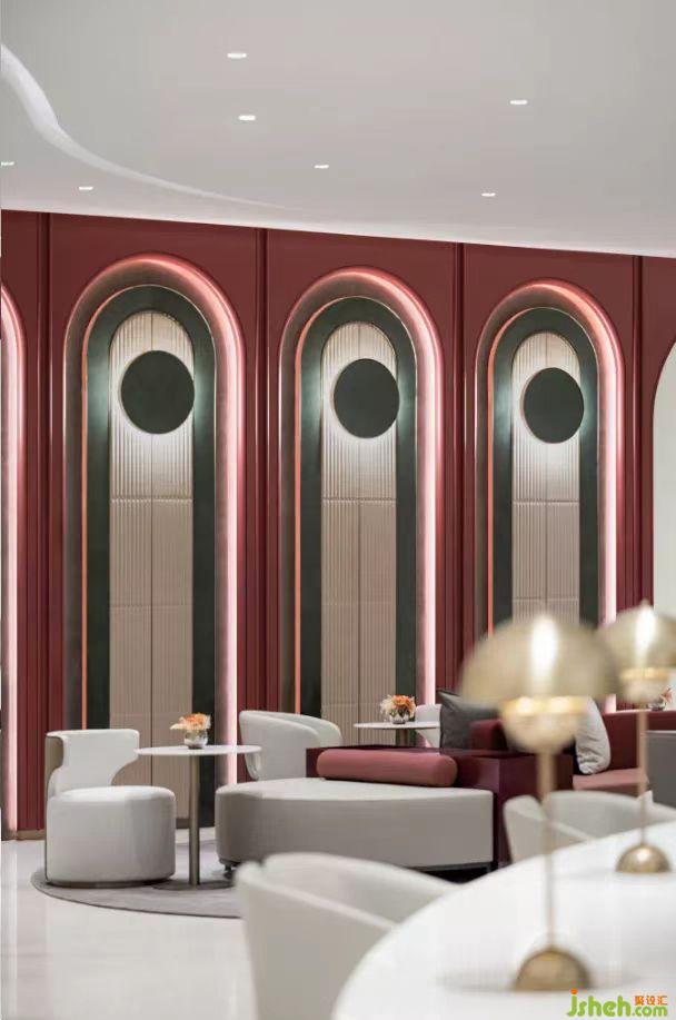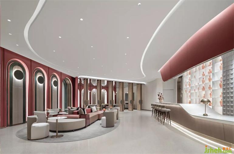 天津,因水而行的城市。水,讓城市充滿靈性,如同流動水系般的造型天花在大面積乳白色的襯托下加入金屬光澤,如繁星點點照亮整個空間。會員中心設(shè)計整體色調(diào)以淡雅灰與優(yōu)雅紅為主調(diào),柔和的弧形曲線,將動態(tài)流動感展現(xiàn),金屬的細(xì)節(jié)點綴,烘托流光溢彩的氛圍。