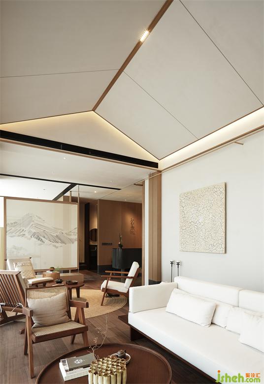 The interior ceiling is simplified with a Chinese sloping roof as a prototype, echoing the theme of Zen. Wood is also used as the primary material. Unlike the dialogue and use of natural elements in the display area, the natural elements in the social living room are mainly through the floor-to-ceiling windows to achieve the intersection of human and natural sight lines.