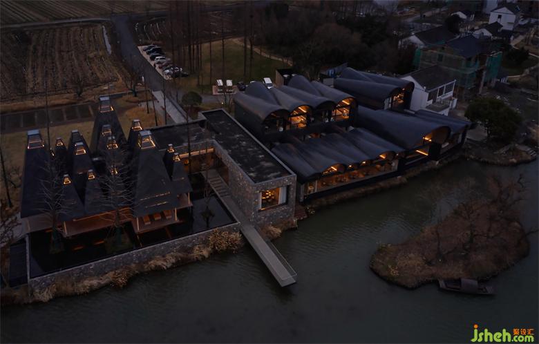 在蘇州吳江區(qū)的善灣村,田園村落的寧謐、河水的幽幽寬廣與歷史文脈相融。船塢酒店便坐落于這悠揚(yáng)空間的風(fēng)景之中。波紋般起伏的黑屋頂建筑群落,猶如聚集起來??堪哆叺臑跖翊瑫r而婉轉(zhuǎn)悠揚(yáng),時而寧靜動人,成為岸邊水墨畫卷的點(diǎn)睛之筆。