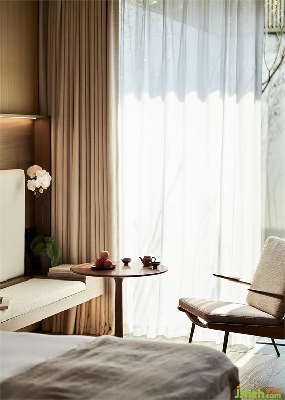 The guest rooms in the quiet area are also equipped with a multi-layer sequence. From the courtyard to the bedroom to the collection, the space progresses from outside to inside and from inside to out.A sunken pool open to the sky's light, a cup of thin wine, at ease.