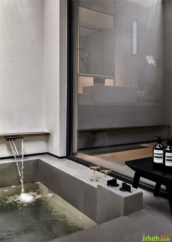靜區(qū)的客房同樣安置了多層序列。從庭院,到臥室, 再到湯池,空間在室外-室內(nèi)-半室外的變化中層層遞進(jìn)。酒店設(shè)計(jì)對(duì)著天光開(kāi)放的下沉式湯池,隨飲?杯清酒,舒適?在。