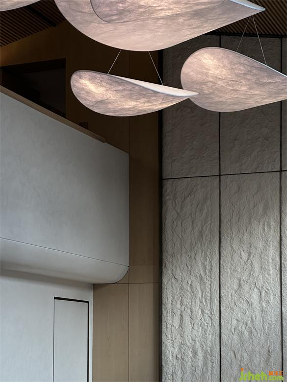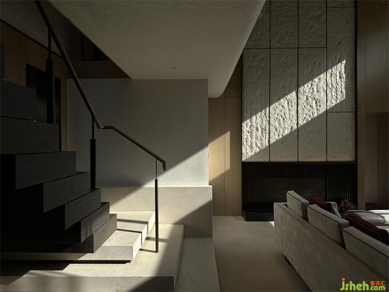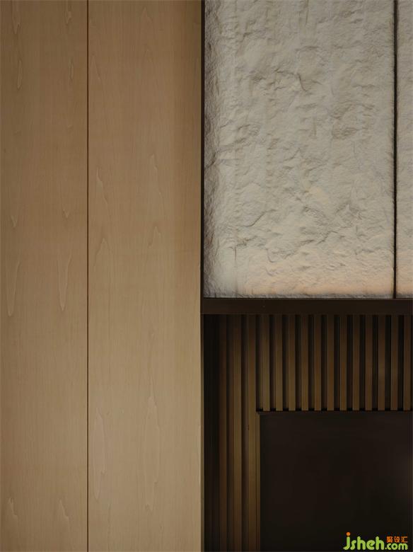 When the light falls on the main background wall above the fireplace, time is also imprinted. The stone sculpture wall and rice paper lamp, the hard and coarse grain and the soft and gentle materials are connected by the injected light, together creating a leisurely and comfortable place.