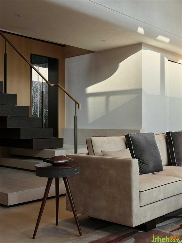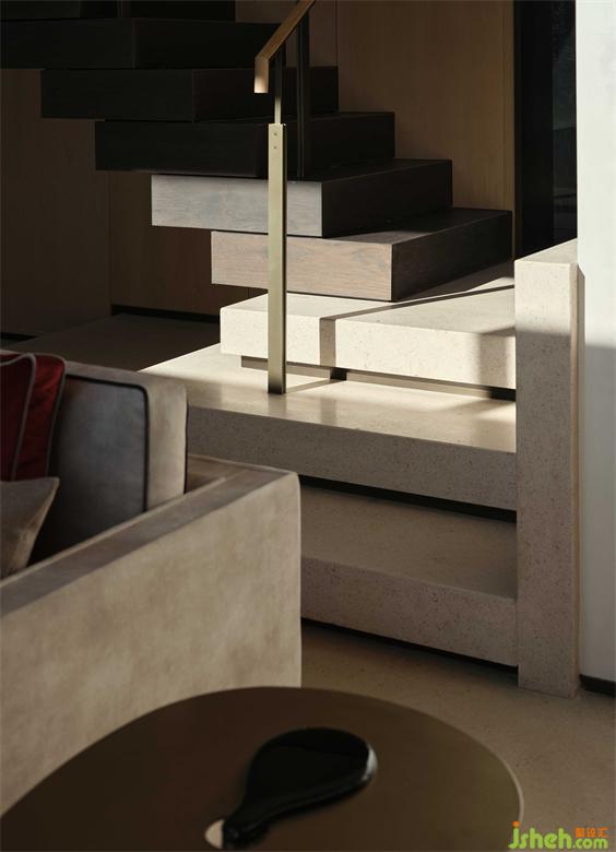 萬科樣板房設(shè)計會客廳后的樓梯向上延展,由溫潤的大理石踏面轉(zhuǎn)為質(zhì)樸的木飾面,行進之間疊級變化。