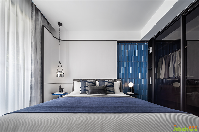 臥室延續(xù)了空間設計的整體性與一體化,比例和諧的藍白搭配又一次被完美詮釋。深圳樣板房設計現(xiàn)代金屬質感的精致吊燈,異形的黑色小雕塑,無一不展示著主人的極高的審美品味。