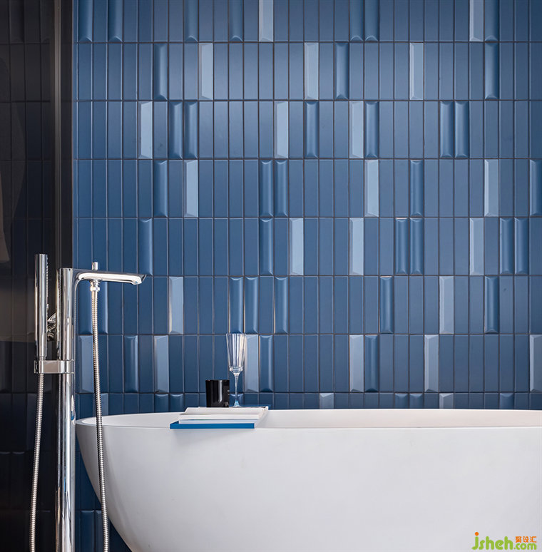 特別定制的藍色系床頭磚型背景材質延伸至浴室區(qū),彌漫著主人無處安放的藝術的追求,獨一無二卻又不顯突兀。