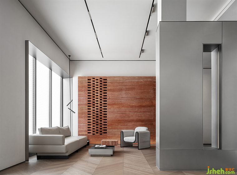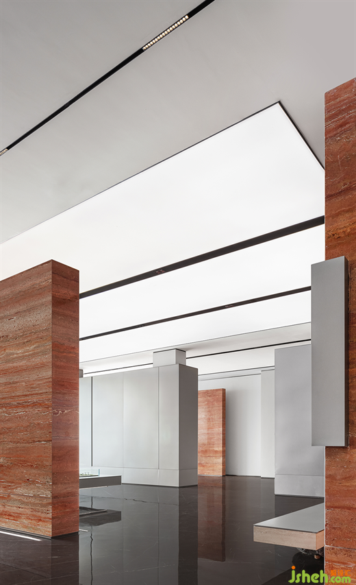 從感官角度出發(fā),延續(xù)了建筑的特性,以紅磚作為線索,貫穿于整個空間,連接接待區(qū)域,文化展示區(qū)及洽談區(qū),引領(lǐng)著觀者的動線。宛如拼圖游戲,回味無窮。紅磚樸素,卻也有讓人眼前一亮的時尚感,讓整個場域增添了返璞歸真的生機(jī)與活力。